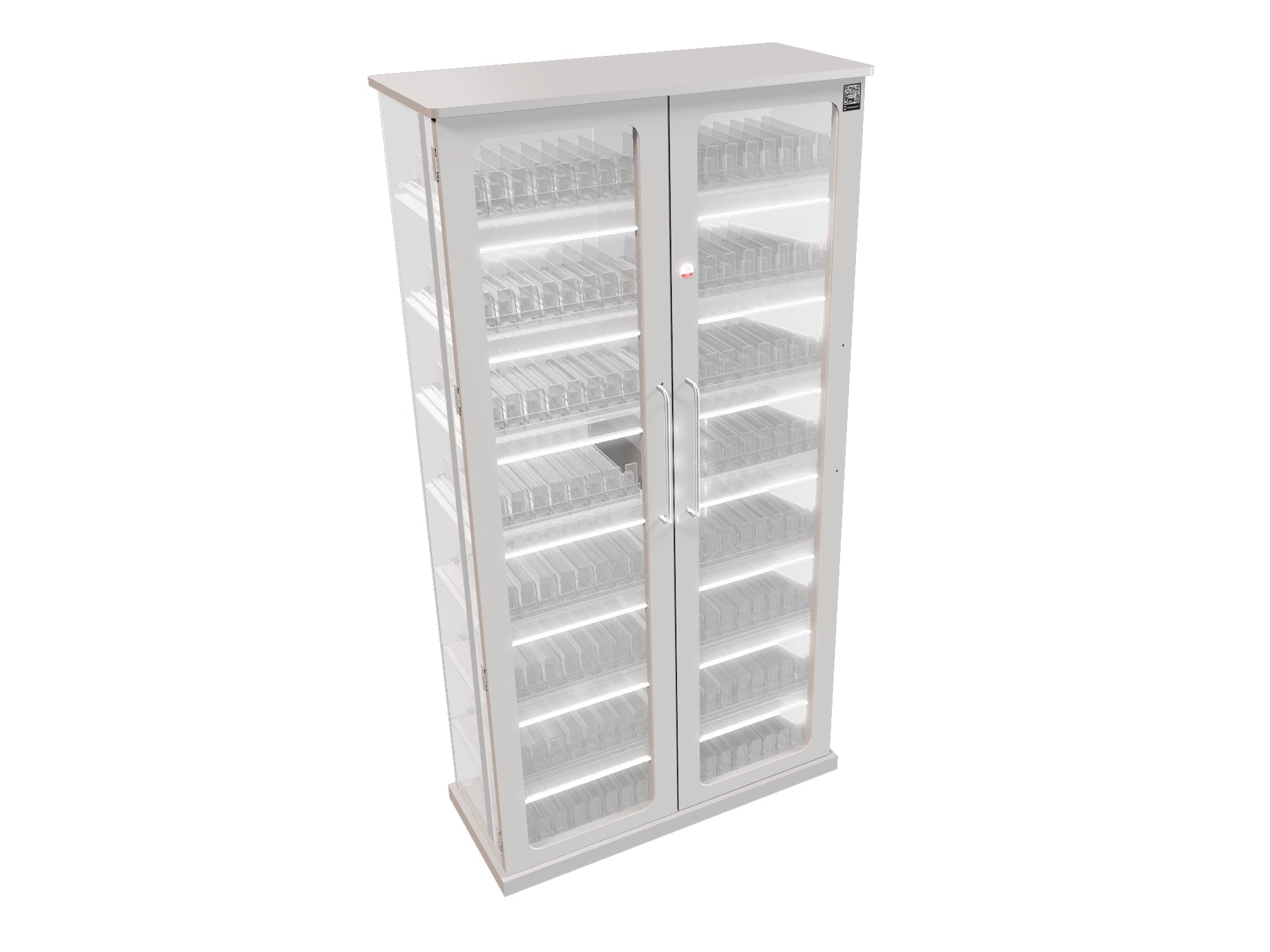 Die Vitrine bietet maximalen Schutz vor unbefugtem Zugriff. Erst nach dem gezielten Öffnen durch einen Mitarbeiter kann der Kunde auf die gewünschte Ware zugreifen. Nach der Entnahme schließt die Tür automatisch und verriegelt sich selbstständig – für ein hohes Maß an Sicherheit im Verkaufsalltag.