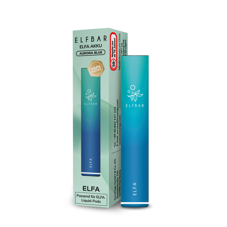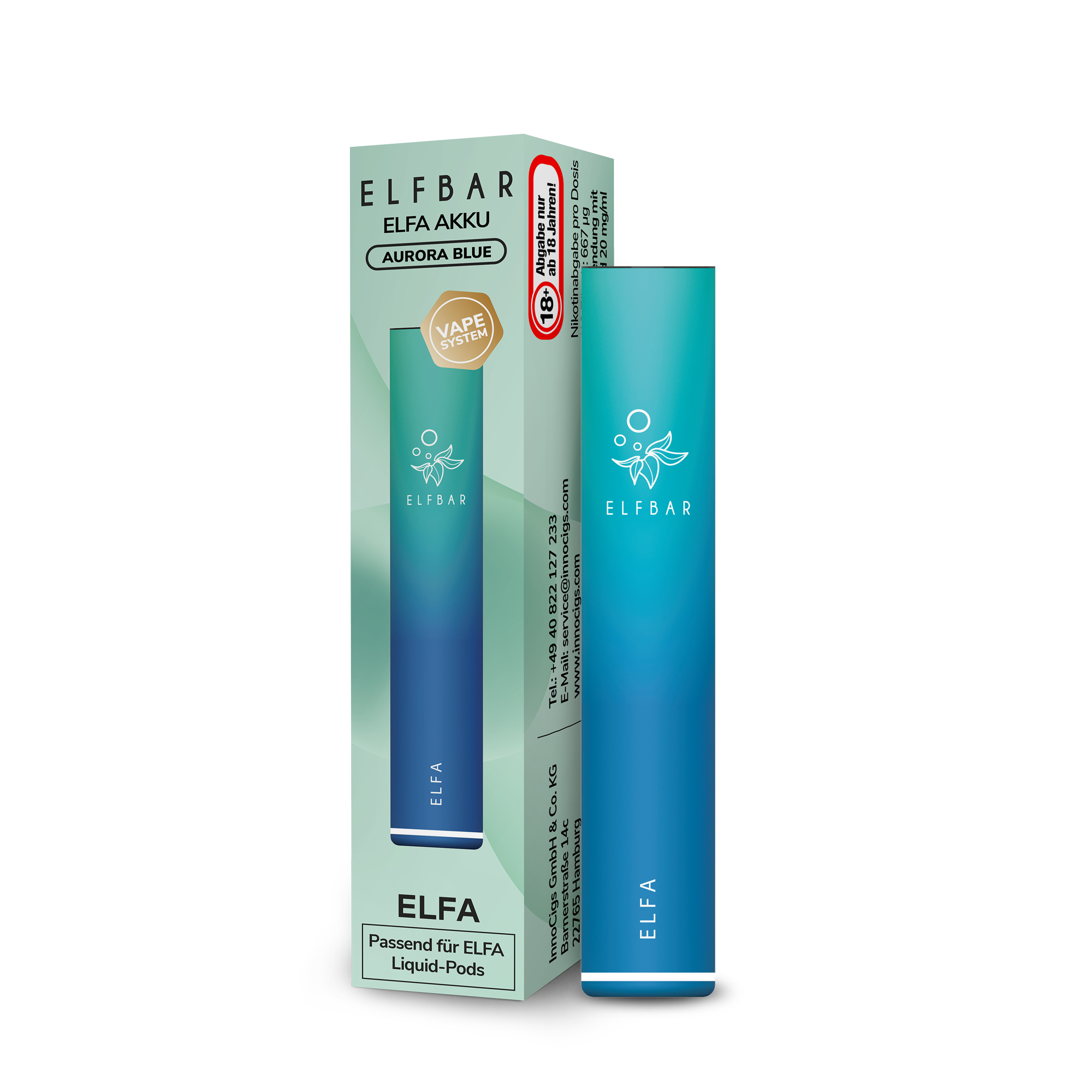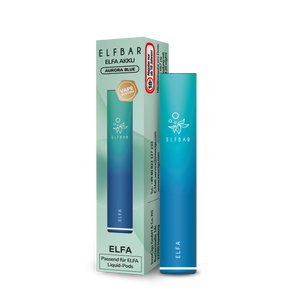 Das ELFA Basisgerät von ELFBAR ist ein kompaktes, leistungsstarkes und attraktiv aussehendes Vape-System. Der Akku hat eine Kapazität von 500 mAh und wird über ein USB-C Ladekabel aufgeladen, welches nicht im Lieferumfang enthalten ist. Er liegt gut in der Hand und kann durch 3 kurze Züge innerhalb von 2 Sekunden ein- oder ausgeschaltet werden.
