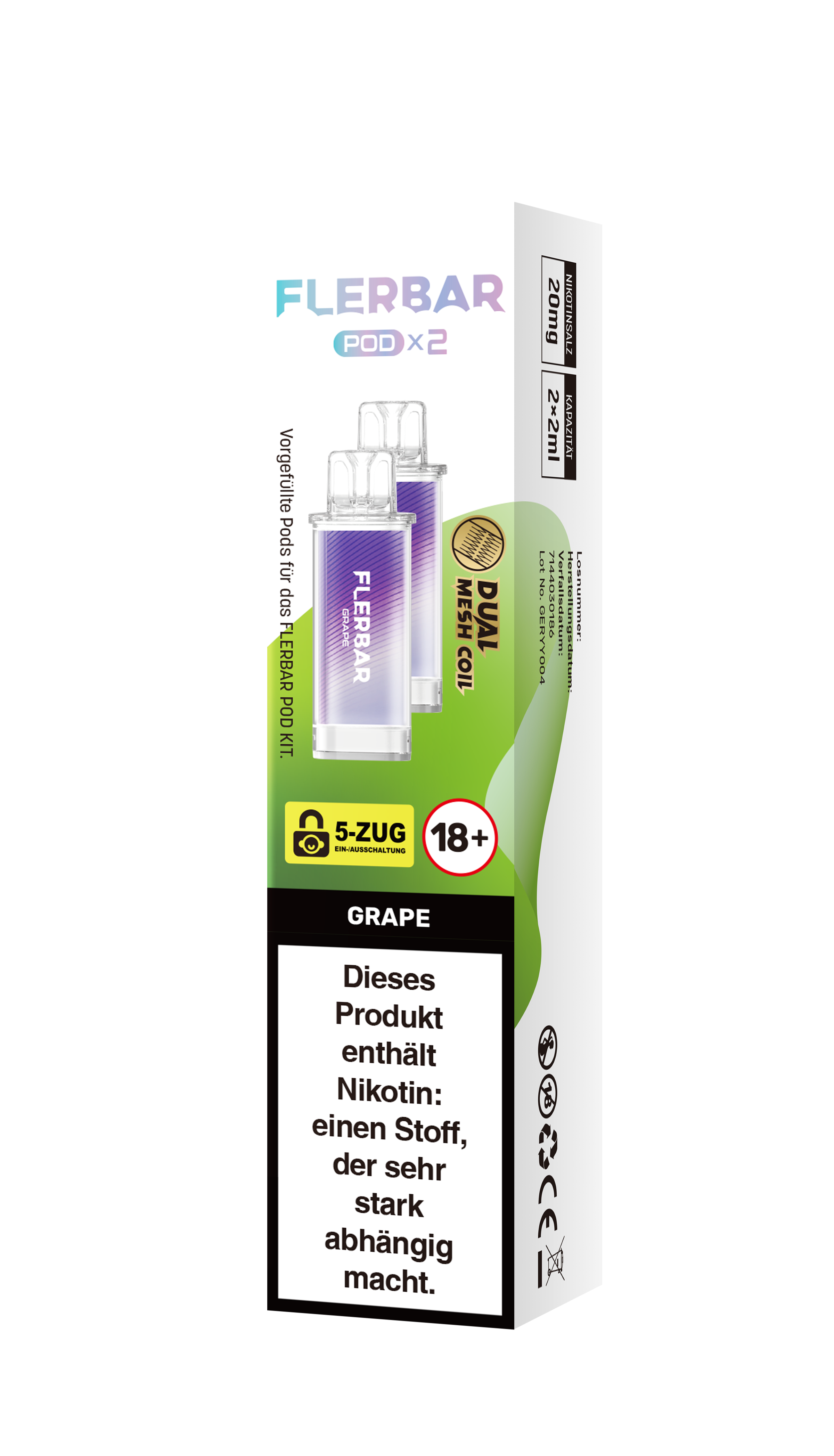 Das Flerbar Pod ist eine vorbefüllte Liquid Kartusche mit 2 ml Füllmenge welche auf die Flerbar Pod Kits (Basisgeräte) passt und den oberen Teil inkl. Mundstück sowie den Geschmacksträger darstellt.